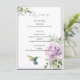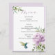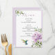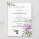 Det är en enkel och underbar bild med vattenfärgen lila ro, löv och en pulserande hummerfågel mot en vit bakgrund med en mjuk lila gräns.