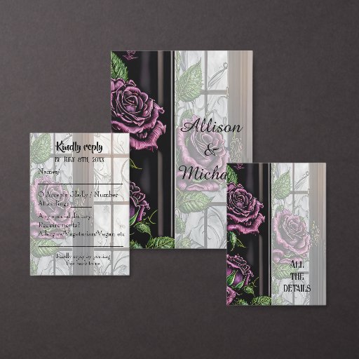 Den här menyn har vacker lila ro i ett fönster i gothic stil. Perfekt för ditt gotiska bröllop eller din årsdag!