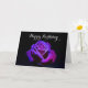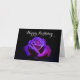 Ett vackert lyckligt födelsedagskort. Ett otroligt foto av en lila ros med fantastisk belysning som framhäver inslag av blå och rosa färger på kronbladen på denna ros. En svart bakgrund i kontrast till belysningen visar verkligen skönheten hos denna blomma, som är täckt av ömtåliga små vattendroppar.