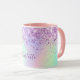 En holografisk trendig med enmajs och regnbåge pastel färg i rosa, lila, ro guld, mynta grönt. Dekorerad med faux glitter damm. Anpassa och lägg till ett namn, skrivet med ett modernt handskript i stil med dekorationer. Lila färgad brev. Om du bara vill behålla utslagen tar du bort exemplet namn lämnar du blankstegen eller symbolerna framför och efter namn.