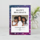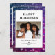 Lila Rosa Rustic Wood Snowflake jul Photo Helgdag Card. Snöflingor överallt. Rustiskt struktur med vackert vitt snöflingor i olika storlekar och former. Lägg till fotot och text framtill och baktill.