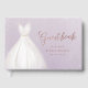 Elegant bröllopsgästbok med vattenfärg vit bröllopsklänning med gnistrande falskt roséguld glitter gästbok script på mjuk lila bakgrund.
