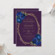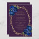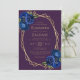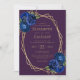 Den här designen har ett guld-geometriskt ram som är dekorerat med royalets blå blommigt bouquets och grönt, som omger guld-färgad-text på djup lila. På baksidan finns utrymme för bröllop-information på en solid lila-bakgrund, tillsammans med en QR-kodgäst som kan söka på webbplatsen och OSAN, vilket sparar kostnaderna för utskrift och utskick av separat OSA kort.