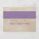 Elegant och chic Rustic Damask Wedding Bordsnummer Postcard med en vintage texturerad papper synbakgrund och ett blomstrande dammmönster gräns i lila. Enkel att anpassa, lägg helt enkelt till rätt bordsnummer i den text fält tillhandahåller. Klicka på Anpassa om du vill söka efter fler anpassningsalternativ.
