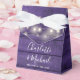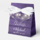 Rustik bröllopspresentlåda med vacker ljusslinga, signaturtextnamn och speciellt datum i modern typsnitt på en bakgrund av lila träpaneler. Du kan anpassa med ditt eget tackmeddelande under locket. Ett perfekt sätt att tacka dina gäster! Designad av Thisisnotme