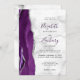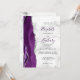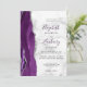Den lämnat kant i eleganten i den moderna bröllopsinbjudan har en lila vattenfärgsagat gräns som trimmas med faux silver glitter. Anpassadet kombinerar handskriftsskript för mörk lila med svart tryckplåt och kursivt typsnitt på en grått- och vit marmorbakgrund. På baksidan finns det utrymme för information om bröllop på en marmorbakgrund, tillsammans med en QR-kodgäst som kan söka efter webbplatsen och OSAN, vilket sparar kostnaderna för utskrift och utskick av separat OSA kort.