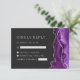 Högerna kant i den här eleganten har ett modernt djurutrymmeskort i bröllop OSA ett lila vattenfärgsagat geodedesign som trimmas med silver faux glitter. Rubriken "Kinely Reply" visas i ett latinskt teckensnitt med anpassade nedanför i silver grått-färgteckensnitt på en svartvit bakgrund. En matchande lila- och silver-agate-design visas på baksidan.