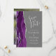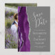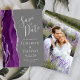 Det moderna bröllop spara datum-kortet från elegantens lämnat kant har en lila vattenfärgsagat gräns som trimmas med silver faux glitter. Med anpassadet kombineras handskrift, tryckplåt och kursivt typsnitt med silver grått på en medelstor grått-bakgrund. Byt enkelt ut exempelbilden på baksidan mot ett eget lodrät-foto.
