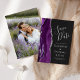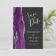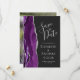 Det moderna bröllop spara datum-kortet från elegantens lämnat kant har en lila vattenfärgsagat gräns som trimmas med silver faux glitter. Med anpassadet kombineras handskrift av silver grått, tryckplåt och kursivt typsnitt på en svart bakgrund. Byt enkelt ut exempelbilden på baksidan mot ett eget lodrät-foto.