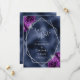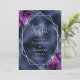 Det moderna bröllop spara datum-kortet i elegant har ett silver-geometriskt ram som är dekorerat med plum lila och silver blommigt bouquets på en marin blå faux foil bakgrund. I anpassadet kombineras silver grått med fysisk handskrift, tryckplåt och kursivt typsnitt. Den omvända sidan upprepar den blå foliebilden.