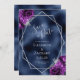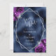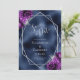 Det moderna bröllop spara datum-kortet i elegant har ett silver-geometriskt ram som är dekorerat med plum lila och silver blommigt bouquets på en marin blå faux foil bakgrund. I anpassadet kombineras silver grått med fysisk handskrift, tryckplåt och kursivt typsnitt. Den omvända sidan upprepar den blå foliebilden.