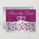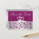 Den här plommon-lilan och silver-grått-blommigten som sparar datumvykortet har ett tryckt lila-band för mörk och båge med ett par tryckt diamantjuvel och FAUX glitter (simulerat) magenta hjärtan på det som matchar de bröllopsinbjudningar som visas nedan. Om du behöver ytterligare matchande objekt kan du skicka e-post till niteowlstudio@gmail.com med din begäran.
