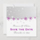 Lila silver grått, vit snöflinga bröllop spara datum, med ett vågat band i silver grått med stjärnor och lila elegant snöflingor. Grått och lila. En perfekt för snyggtens utformning inför vintern, december eller julen i bröllop. Modern och contemporary som ändå passar för ett traditionellt bröllop. Denna elegant, denna klassutformning kan användas för andra särskilda tillfällen, t.ex. förlovningar eller årsdagar.