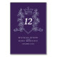 Lila och silver vapensköld teckning art bordsnummer. Redigera bordsnumret bröllop med datumet par namn och bröllop. Bord-kort måste läggas till i din kundvagn en i taget, rabatter kan gälla för många-kort. Ursprunglig utformning och vapensköld med hjärta krona, med löv och bär hand teckning av Sarah Trett för www.mylittleedenweddings.com endast på Zazzle.