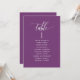 Hjälp dina gäster att hitta sitt bord med dessa eleganta moderna sittplanskort med gästernas namn. Dubbelsidiga kort så att gästerna kan leta från både framsida och baksida efter sina namn. Tydligt utrymme runt omkring ger dig friheten att använda klämmor eller hålslag för upphängningsdisplayer, eller använda bordshållare/ram. Lila tonad bakgrund och vit text. Moderna handskrivna kalligrafidetaljer. Flera färgalternativ. Ha alla bordnummer i samma färg eller blanda färger enligt ditt events färgtema.