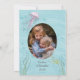 twillingar för lila sjöjungfru (eller systrar!) på en vågigt akvablått bakgrund dekorerar framsidan av denna inbjudan till nyfödsel. På baksidan hittar du en söt lila-maneter och plats för foto och anpassning. Den här söta designen kommer att glädja sjöjungfru fläkt i alla åldrar och kan användas för tvilling- eller systerfödelsedagsfester.