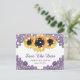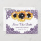 Elegantens vykort för rustisk lila och bröllop spara datum med solblommor, ljus och blommigt snöre som är idealiska för din lila land, trädgård, bakgård eller ladugård som är inspirerad av solblommor. Matchningsartiklar som är tillgängliga för att komplettera dessa vykort för lila och gult vid bröllop spara datum vid rustik blommigt.
