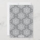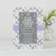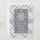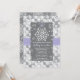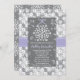 En vacker snowflake-möhippa- eller möhippa-inbjudan med en frostig silver-, grått- och vit subtil damm, blommigt- och snowflake-gräns med ett tryckt lätt lila-sytt band-utseende. En söt vit snowflake bunden av en ömtålig lavangarmbåge hänger från toppen av kortet med hjärtformade snö-reflektioner bakom det. Baksidan av inbjudan har ett upprepande hjärta och snöflinga mönster. Bild © Krissy H. Studios, LLC. Alla höger reserverade.