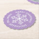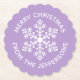 En vit snöflinga på ljusa lila-/lavendelbakgrund med "God jul" från familjen i en cirkel runt den.