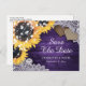 Postkort för personlig lila och solros bröllop spara datum med solblommor och eukalyptus på en lada-bakgrund som är försedd med brännhjärtor, vit blommigt snöre och ljus. Perfekt kortdesign för din lila rustic land, bakgård eller lada-bröllopsfest inspirerad av solrosblommor. Matchande objekt är tillgängliga.