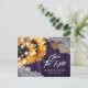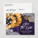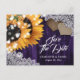 De här plakaten av rustiskt trä, burlap och snöre solrosolja i bröllop spara datum är idealiska för din lila bröllopsfest av rustik inspirerad av solrosblommor. Matchande objekt är tillgängliga.