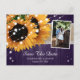Dessa rustika bröllops korts för att spara datum med solrosor på säckväv och spets löpare mot en gammal trävägg är perfekta för ett lila rustikt bröllop inspirerat av solrosor.