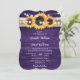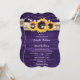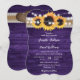 Rustisk lila och inbjudan till solrosbröllop som innehåller solblommor och snöre ljus mot en bakgrund av rustiskt trä som är försedd med burlap- och snöre-band. Två stövlar på baksidan. Anpassa enkelt det här lila blommigt bröllop-kortet med dina uppgifter om bröllop.
