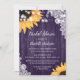 Fira bruden som ska vara med den här eleganten, rustik lila blommigt inbjudningskort för möhippan med solblommor på en träbakgrund med vit blommigt snöre och ljus.