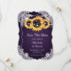 Rustik lila bröllop save the date-kort med solrosor och strängljus på en lila gradientbakgrund.