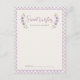 Skapad för att samordna med födelseannons-samlingen "Sweet Floral", har detta fina kort med texten "Sweet Wishes for Baby (Namn)" en ram bestående av en krans med ömtåliga blommor och blad. Det finns också plats längst ner för vännen eller familjemedlemmens namn. Designen och texten är placerad över ett lila, handritat rutmönster. Detta kort är perfekt för baby shower, men också för bröllopsfester och bröllop. Andra idéer för fraser är: "Sweet Wishes for the Bride-to-Be", "Sweet Wishes for the Happy Couple", eller "Date Ideas for the Newlyweds".