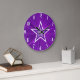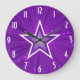 Modern design med en "strålande" lila och vit stjärna på en "glödande" bakgrund. Väggklocka med en utformning av anpassadet som du kan anpassa med din egen text, bilder och dina idéer. Observera att detta är en tryckt bild som skapats med originalfotografier och digitalteknik, som inte skiner eller innehåller riktiga miniatyrbilder.