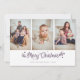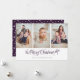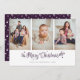 Anpassningsbar lila God jul-fotokort med tre foton med en calligraftitel på framsidan och en lila bakgrund med stjärnor på baksidan. Anpassa enkelt de här lila kalligrafibilderna till julfoto med bilder, en familj namn och året.
