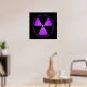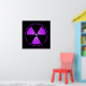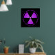 Svart poster med lila strålningssymbol omgiven av "Fara - Strålning" i upprepad lila.