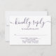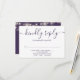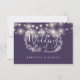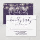 Ett stilrent RSVP-kort med dina detaljer i chic typografi och personifierat med dina namn, handritad blomsterlövverk och strängljus på en lila bakgrund på baksidan. Designad av Thisisnotme©
