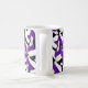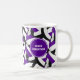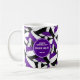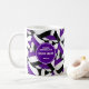 Det här lila, svarta och vita laget färg volleyball med temat kaffe mugg kan anpassas med buss namn på en vit volleyball-grafik på ena sidan av mugg och lagets namn, namn och idrottssäsong/år på en andra vit volleyball-grafik på andra sidan - är en grupp av lila, svarta och vita volleybollar som är placerade i en överdimensionerad spegelrött. mönster - av katz_d_zynes