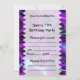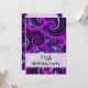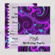 Födelsedagsfest inbjudan med en funky hippy stil swirl fractal art mönster i olika lila.