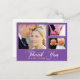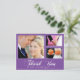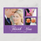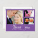Anpassa den här snyggten det moderna vågrät Tack Bröllop-vykort designat med romantisk manusvit text på lila. Byt ut de tre mallarna bilder mot dina favoritfoton och ändra all mallinformation på båda sidor med din egen. Den här utformningen har en formulering: "Tack för att du delar på vår speciella dag", men du kan ändra ord med ditt eget. *Fotomall kredit: © Sean McGrath
