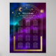 Kosmiskt Lila Teal Guld Sol Stars astronomi Bröllop sätesdiagram Bröllop Poster Utskrifter har guld Måne, sol och stjärnor med en gyllene måne på färglös mystisk ram, teal och blå kosmisk bakgrund. Inuti ram finns texten "Välkommen" i det vita kalligrafiskriptet för elegant och information om mottagningsdiagrammet för personligt bröllp. Designad för dig ©Evco Studio www.zazzle.com/store/evcostudio
