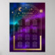 Kosmiskt Lila Teal Guld Sol Stars astronomi Bröllop sätesdiagram Bröllop Poster Utskrifter har guld Måne, sol och stjärnor med en gyllene måne på färglös mystisk ram, teal och blå kosmisk bakgrund. Inuti ram finns texten "Välkommen" i det vita kalligrafiskriptet för elegant och information om mottagningsdiagrammet för personligt bröllp. Designad för dig ©Evco Studio www.zazzle.com/store/evcostudio