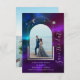Den kosmetiska Lilan Teal Sol Måne Stars Space Cosmic Galaxy Celestial Bröllop spara datum har en ram i silver sol, måne och stjärnor på en helig bakgrund. Inuti finns ditt favoritfoto och din anpassningsbar sparar datuminformationen. Lägg till ytterligare ett foto på motsatt sida. Anpassa genom att redigera texten i textrutorna. Designad för dig ©2022 Evco Studio www.zazzle.com/store/evcostudio