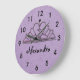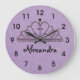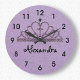 Den här väggklockan skrivs ut med en tiara-bild av söt lila på en lila speglad utseendebakgrund, med enkla och läsbara svarta siffror. Var snäll mot en liten flicka som kärlek prinsessan temar. Ditt val av kvadrat eller rund.