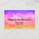 En övertoningsbakgrund som sträcker sig från royalets lila överst till den gyllene orangen vid grund, som är skild från en våg av vit rök, skapar perfekten, professionellens affärskort för en skönhetsbutik. Baksidan är en ljusare version av övertoningen, med utrymme för mer information, belöning för kundlojalitet eller avtalade tider.