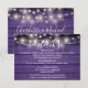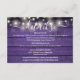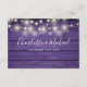 En rustic informationskort för bröllopsdetaljer med vackra strängar av lampor och lila träpaneler som bakgrund. Anpassa med dina speciella detaljer i stilfull typografi och era namn och bröllopsdatum på baksidan. Designad av Thisisnotme