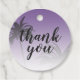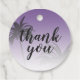 Chicens favorittagg för bröllop med en tropisk handflatan träd-design mot en bakgrund för solnedgången lila med texten "tack" i elegantens skript. Lilan tonas ut mot en vit bakgrund. Perfektens bröllop tack märkrn för att du har lagt till en chic personlig beröring till dina bröllopsfavoriter. Om du behöver hjälp eller matchande produkter kontaktar du oss genom vår butik. Vi är lycklig för att hjälpa dig att göra bröllop till den vackraste dagen. Enbart designad för dig av Lycklig Dolphin Studio.