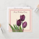 Ett foto på tre rikers djupa burgundi-lila-tulpaner på en krämbakgrund med gräns i två skuggor av en blek och djupare rosa. Texten finns i ett matchande formellt skript för lila, med all information om firande party på baksidan som ska fyllas i. På basfärgen, vit lagrar som lätt kan förändras.