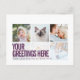 Personliga lila vita 6 familjebilder Moderna och skarpa Universella Hälsningskort med en stilren fotokollage med 6 anpassade bilder, ditt hälsningsmeddelande i fet och iögonfallande modern sans serif-teckensnitt, ditt namn, datum, år, meddelande på baksidan i ett minimalt typografiskt och coolt sans serif-teckensnitt. Svart och vit minimalistisk estetik, men du kan redigera vykortet i valfri färg.