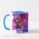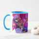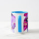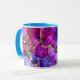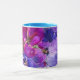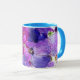 En vit ringsignal mugg med pulverblått handtag och fälg, dekorerad med en handmålad vattenfärg och bläck design av lila blommor.