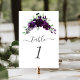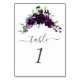 I eleganten har det moderna bröllop-bordsnumret en vattenfärgsspray av mörk lila blommor och grönt löv på vit bakgrund. Ord "bord" visas i handskriftsskript för kol-grått med blommor i början och slutet. Det redigerbara talet visas nedan i stort kursivt serif-teckensnitt.