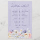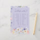 Engagera dina gäster i lekfulla förutsägelser med vårt "Would She Rather"-bröllopsduschspel, vackert inramat med handmålade pastellfärgade vilda blommor och ömtåliga rosa och lila fjärilar på en mjuk lavendelbakgrund. Detta charmiga spelkort lägger inte bara till roligt till din händelse utan kompletterar också vackert den förtrollande tematiken, vilket gör det till ett perfekt tillägg till dina bröllopsduschaktiviteter.