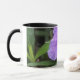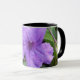 En vitmugg med svartklippning och puple blommar.